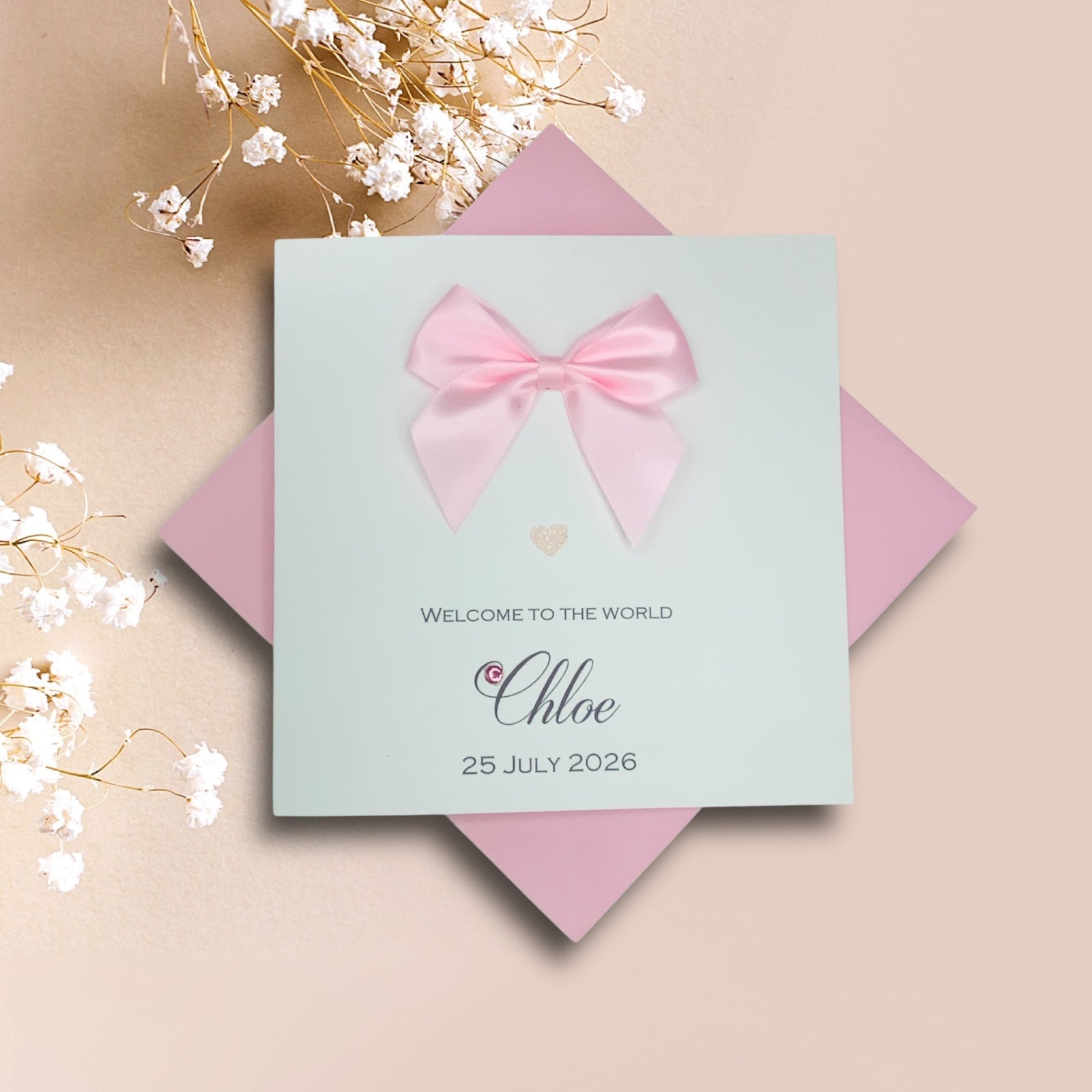 New Baby Girl Congratulations Card - Personalised Handmade Luxury Card - Regal Bow