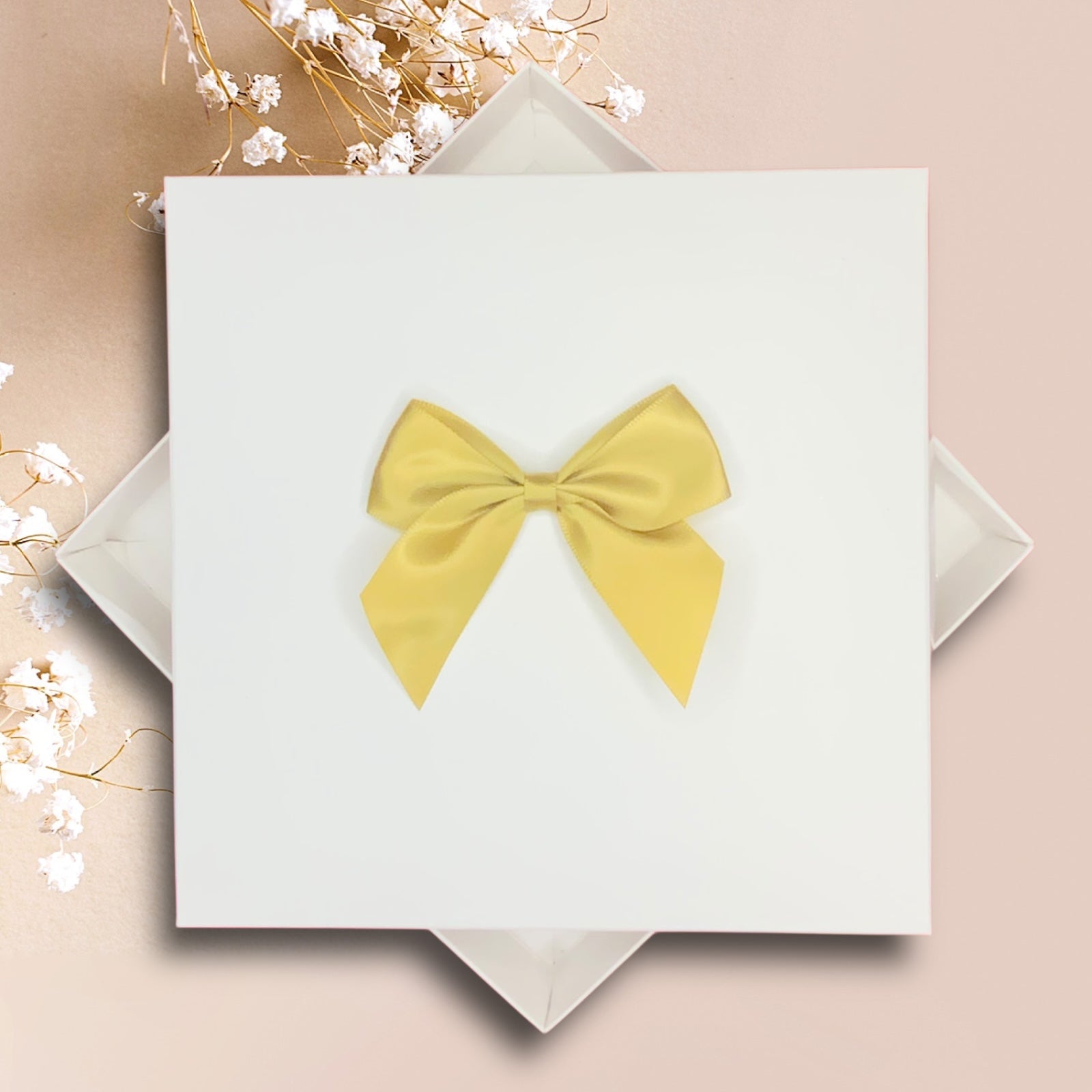 • Load image into Gallery viewer, A white square box with a yellow bow tied on top, placed on a pink background.