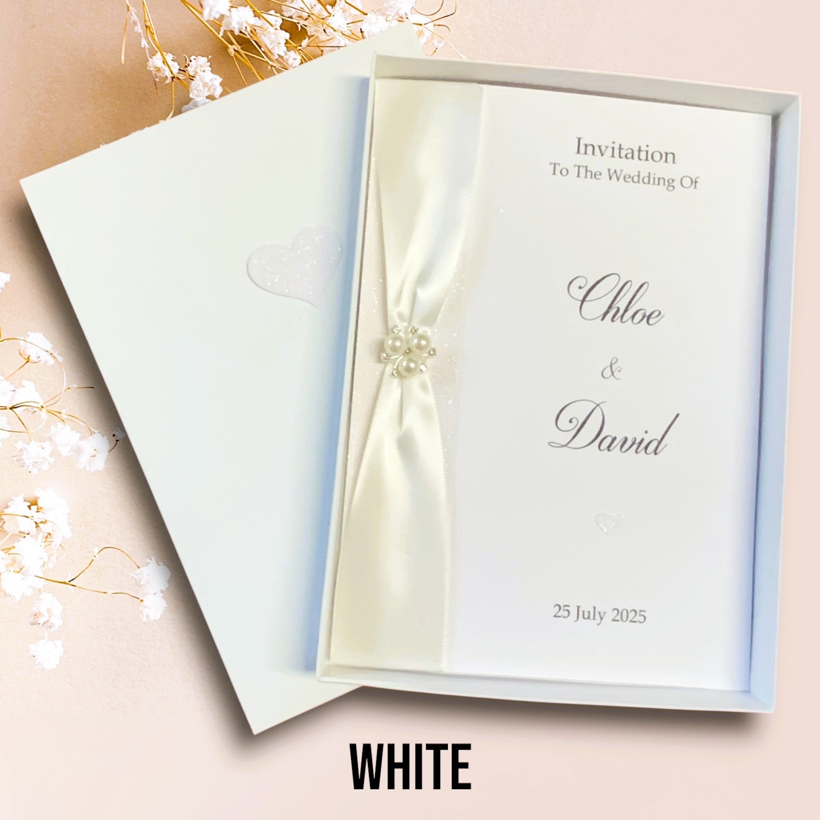 Choose White envelope or Gift Box with coloured glitter heart to match your invitation colour choice.